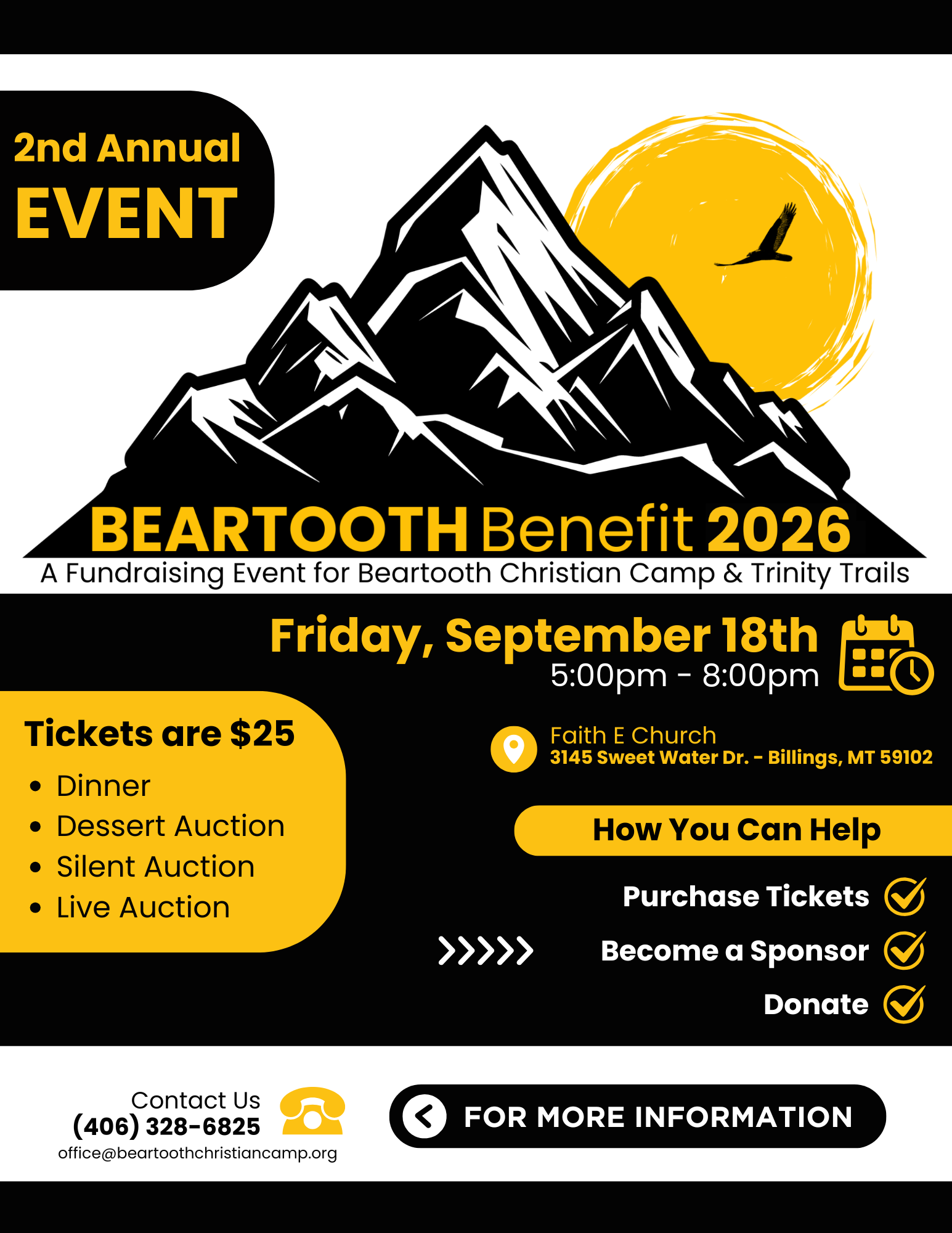 The evening will feature a delicious dinner, a tempting dessert auction, a robust silent auction, and an exciting live auction with items everyone will want to bid on! Come enjoy great food, meaningful fellowship, and a fun night out while supporting two ministries that make a lasting impact. All proceeds from the event will go directly toward Beartooth Christian Camp and Trinity Trails.
